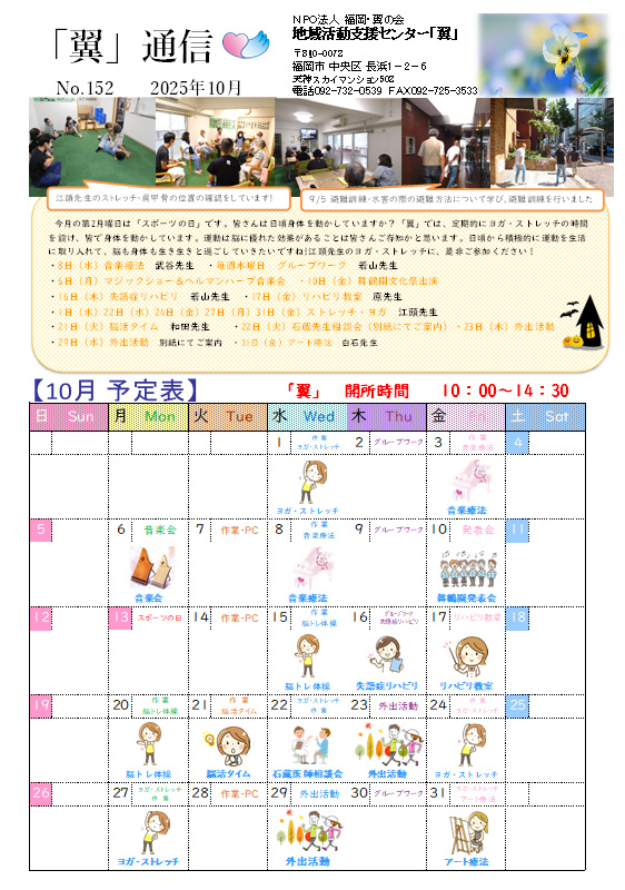 「翼10月の予定表、失語症リハビリ,音楽,アート療法,ストレッチなど |