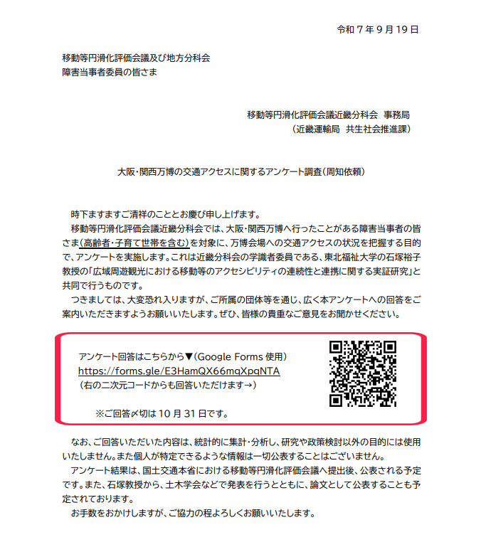 お願い:大阪・関西万博に行かれた障害者の皆様への 交通アクセスに関するアンケート |