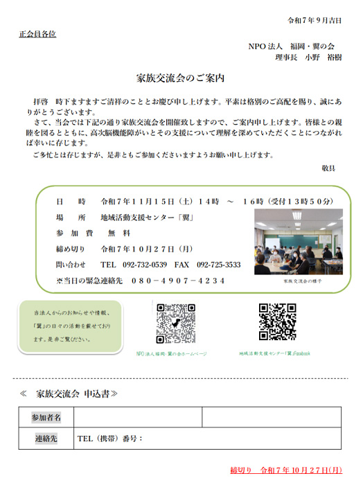 対 象: NPO法人福岡・翼の会の 当事者・家族の皆様 |