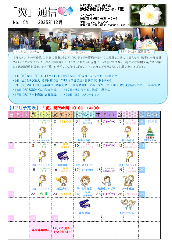 2025/11/30Up:「翼」12月の予定表、失語症リハビリ,音楽,アート療法,ストレッチなど 、Top画像 |
