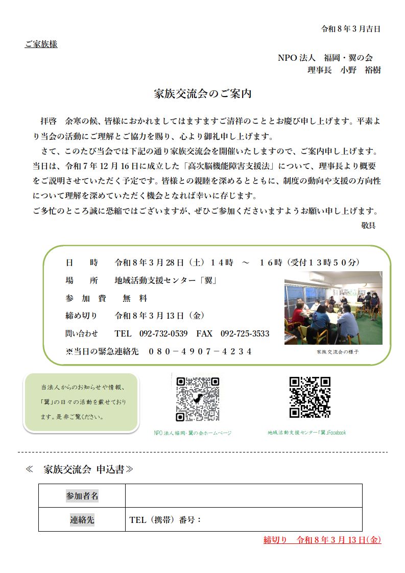 対 象: NPO法人福岡・翼の会の 当事者・家族の皆様 |