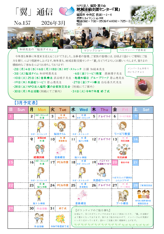 2026/ 2/27Up:「翼」3月の予定表、失語症リハビリ,音楽,アート療法,ヨガ・ストレッチなど 、Top画像 |